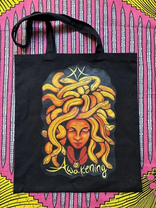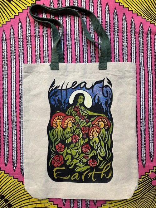 Tote bags are heavy duty canvas, 100% cotton. Heart Earth is printed on a natural tote bag with dusty green handles. Awakening is printed on a black tote bag.