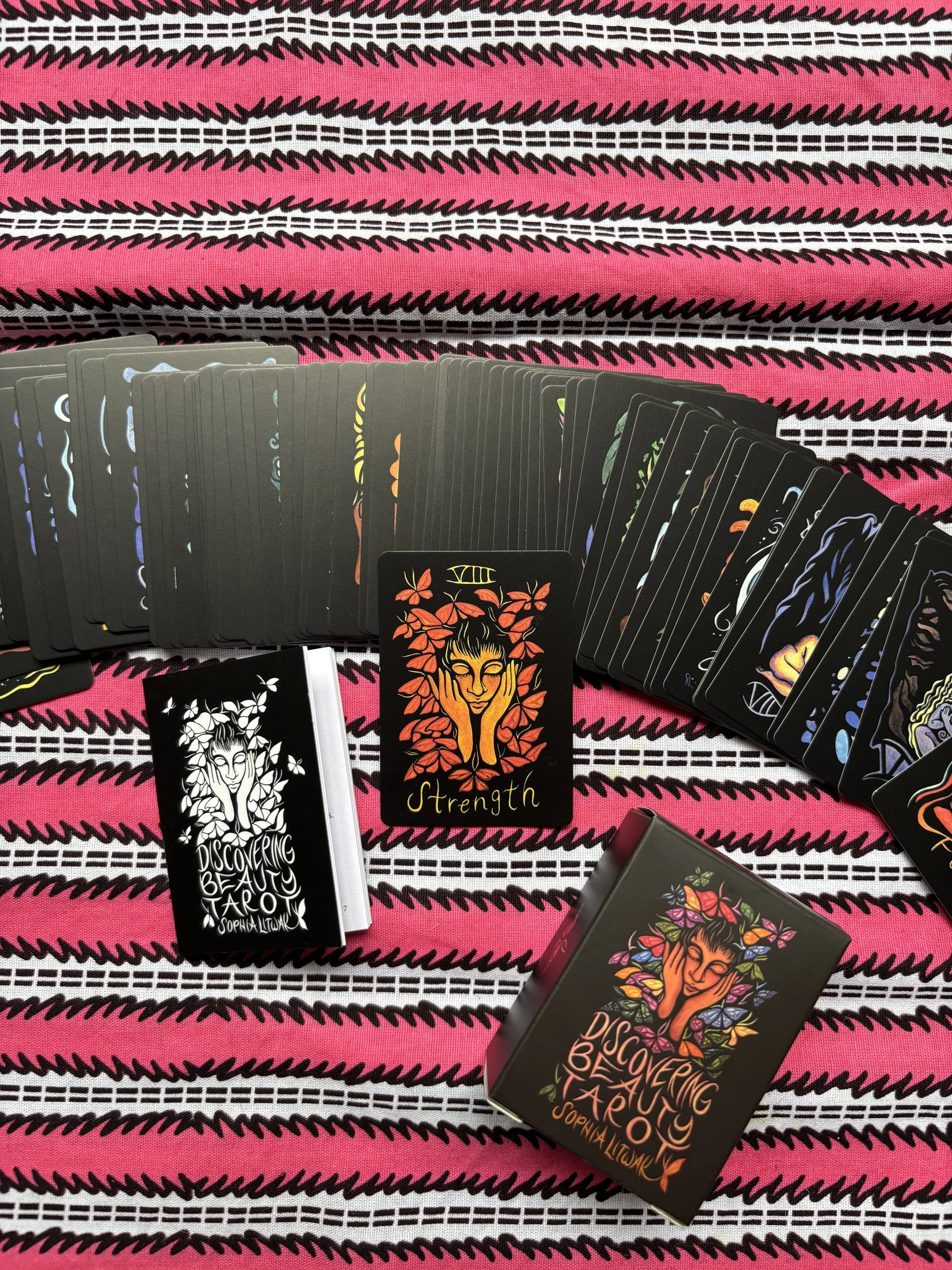 The mini deck of Discovering Beauty Tarot comes at 45 x 64 mm (1.75 x 2.5 inches), on 300gsm paper in a tuck box with a 25-page booklet. The images for the 78 cards are on black backgrounds. The mini deck is excellent for keeping in your daily bag or for taking on a trip.