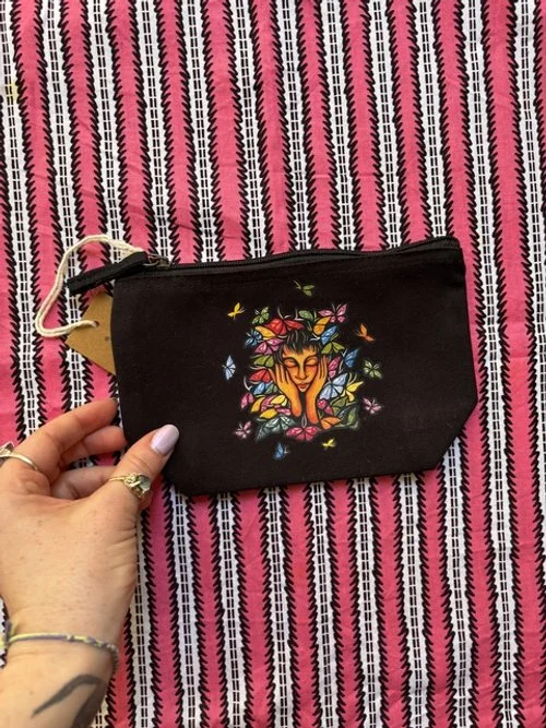 Card pouches are 100% organic cotton canvas, 20 x 11.5 cm (roughly 8 in x 4.5 in), zip closure.