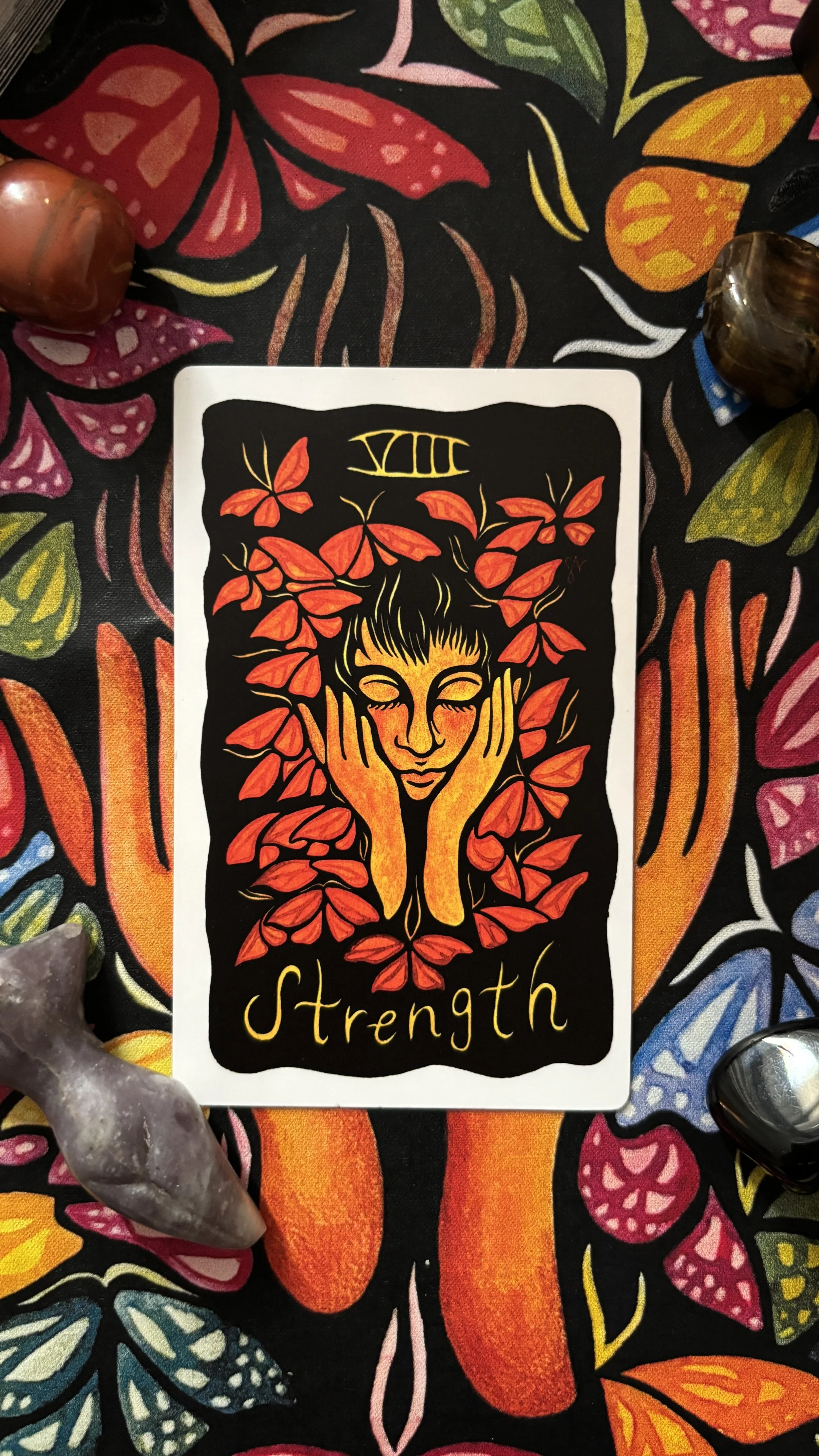 The cards are 70 x 112mm (2.75 x 4.4 inches, slightly shorter than a traditional Tarot deck) and are printed on 350gsm paper, in a matte lamination finish with black matte edges.