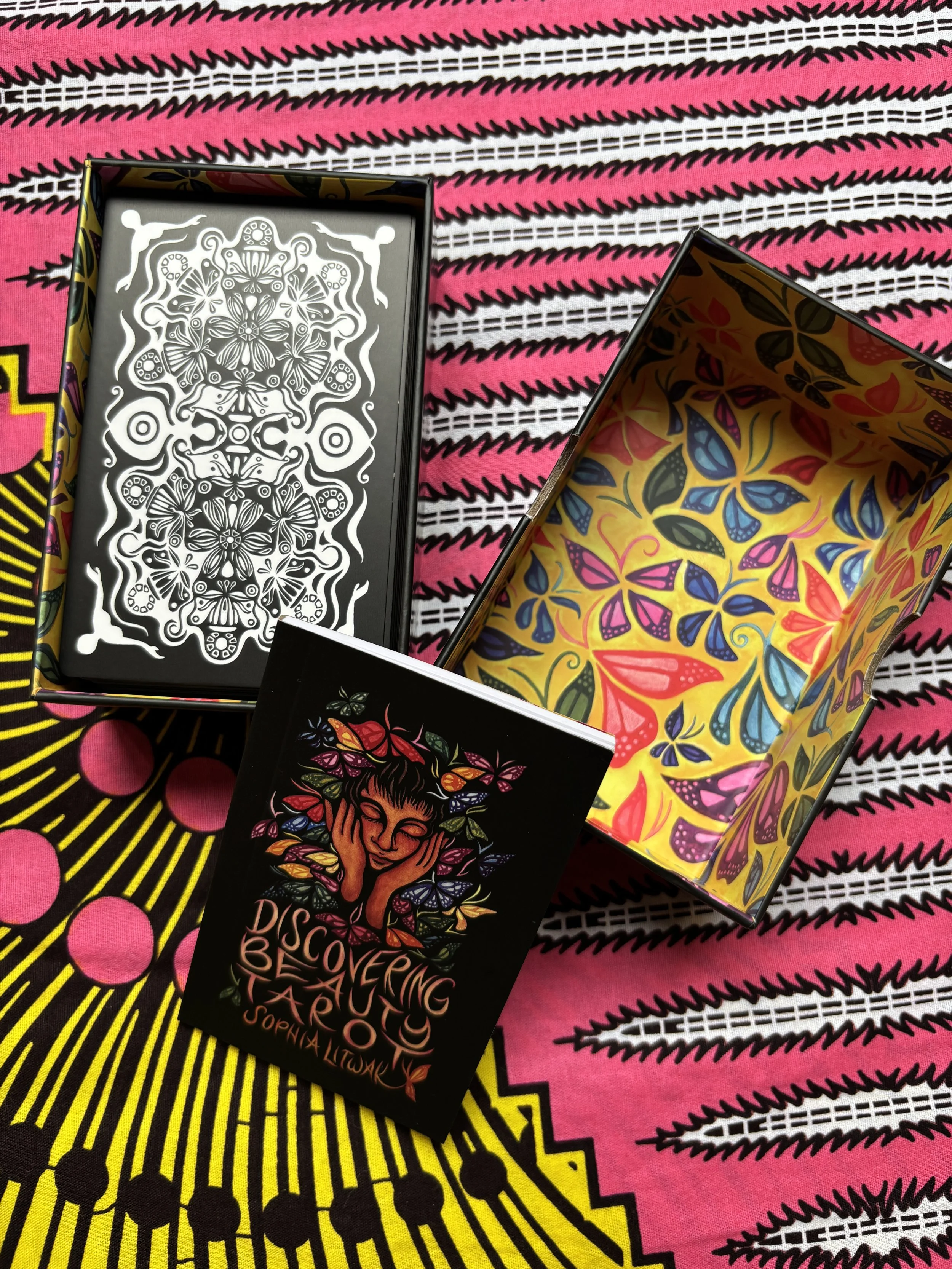 The standard deck of Discovering Beauty Tarot is in a two-part box with a full color inside. The images for the 78 cards are on white backgrounds with their original raw ink edges.