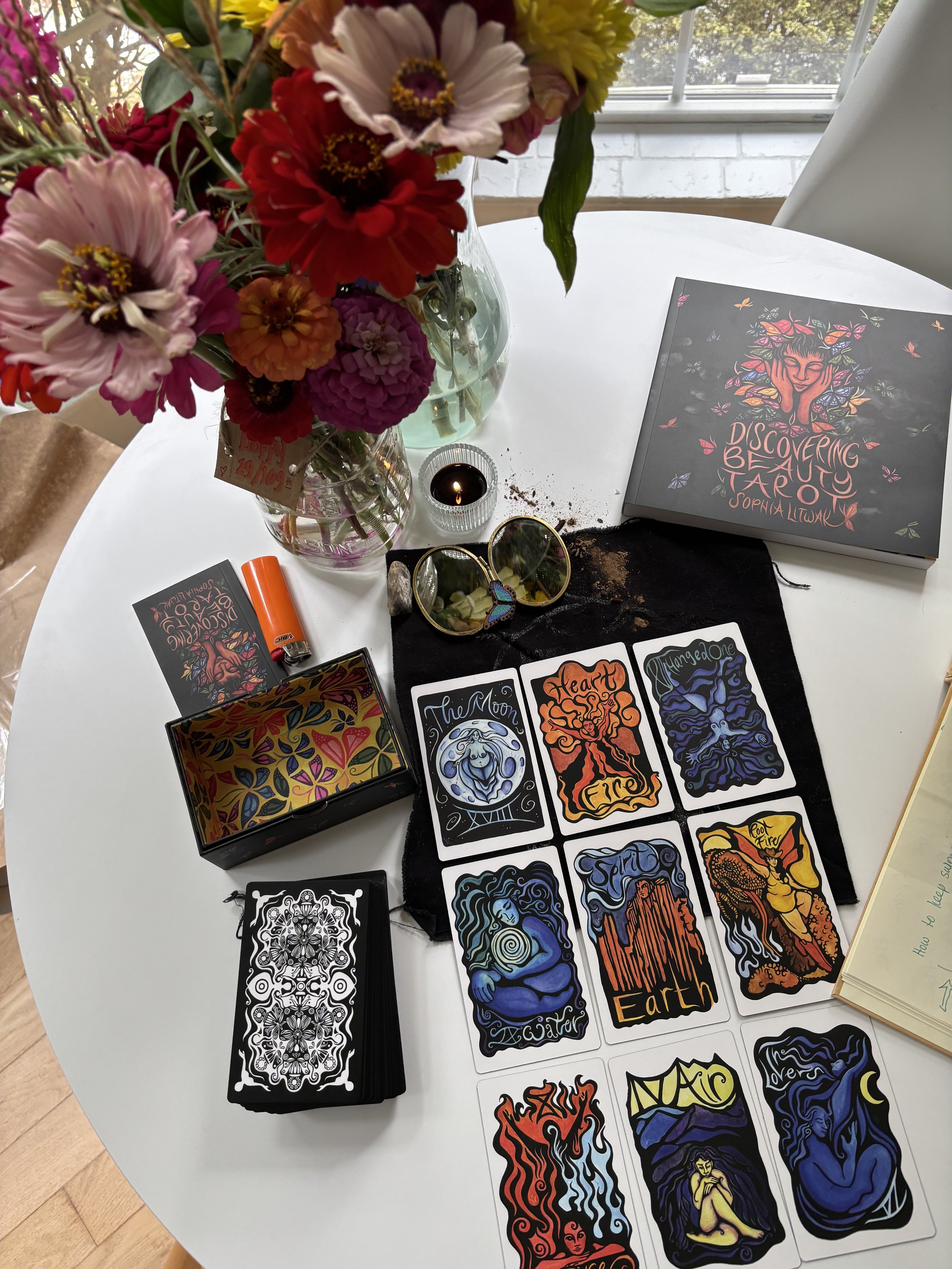 I have been reading Tarot cards for others for over ten years, and I have had a relationship with the cards all my life. I read with my own deck, Discovering Beauty Tarot, which is rooted in the belief that all beings contain immense beauty and that we share a responsibility for one another.